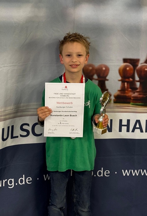 Fangen wir mit dem an, was Konstantin am Ende des Tages in den Händen hielt: der Pokal des Hamburger Grundschulmeisters bis 2. Klasse. 7 aus 7. Einziger Spieler im gesamten Turnier mit weißer Weste. Keine einzige Partie abgegeben, keinen halben Punkt verschenkt. Wenn Konstantin im Dezember zur Ehrung ins Rathaus marschiert und der Senatorin die Hand schüttelt, wird er den Weg dorthin vermutlich schon vorher im Kopf geübt haben. Wir freuen uns riesig mit. Fun Fact: Seinem großen Bruder Jonathan gelang vor 3 Jahren das gleiche Kunststück.